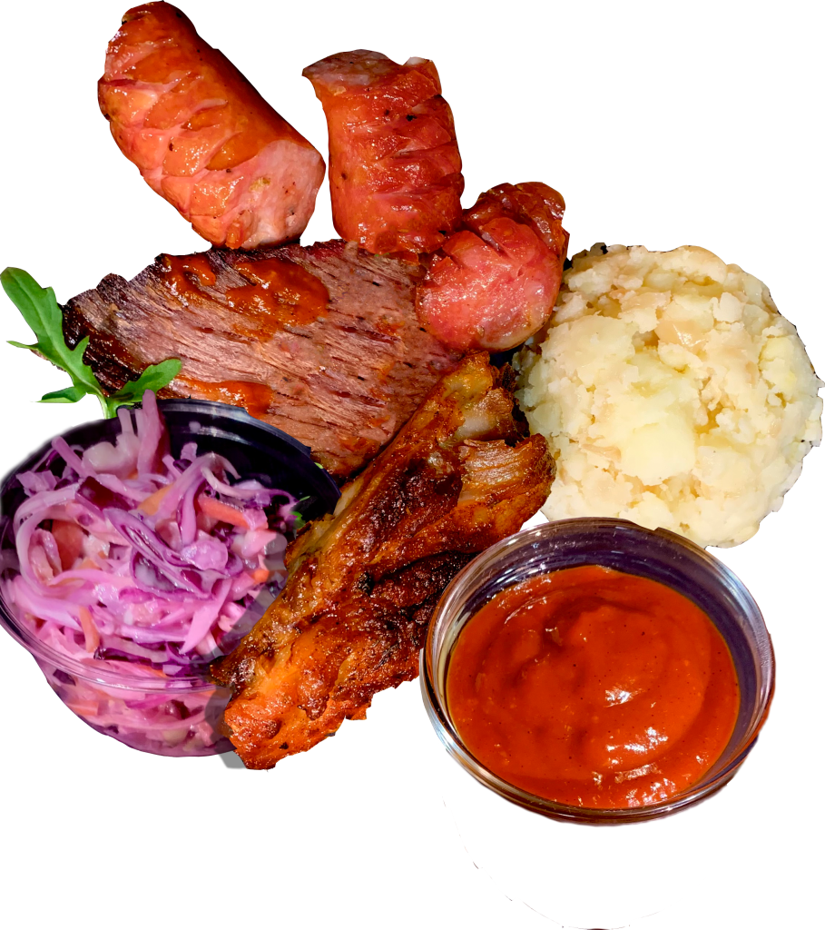 A Füstös Kavalkád egy mélyen gyökerező, mégis modern fogás, amely a magyar ízvilág klasszikus hagyományait ötvözi az amerikai BBQ-stílussal. Ebben az ízekben gazdag válogatásban a zamatos, grillezett kolbász és a marhaszegy találkozik a házi BBQ szósszal, míg a friss, házias coleslaw és a burgonya tökéletes kísérőként szolgál egy igazán kiadós és emlékezetes étkezéshez.